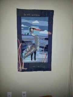 I am one of those people who love a finished project and I always inquired of mom what this piece would look like – I always loved it. A few years ago on one of her visits, she brought me a gift. Unwrapping the paper, I discovered it was this heron piece, now completely finished and transformed into a quilt to hang on my wall, decorated with borders of familiar fabric and the scripture, “Be still and know that I am God.” I loved it and immediately hung it on the wall.
