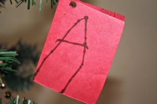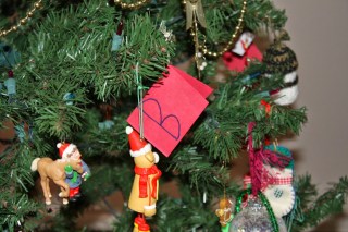 Last year the kids and I did this again, except this time we kept better records. I cut little pieces of red paper, folded it in half and had one of them write the letter on the front. Then, when you open it up, on the inside is the scripture we picked. Then I punched a hole at the top, strung some yarn through it and hung it on an old, worn out miniature tree I almost threw away. This is just what I had on hand.