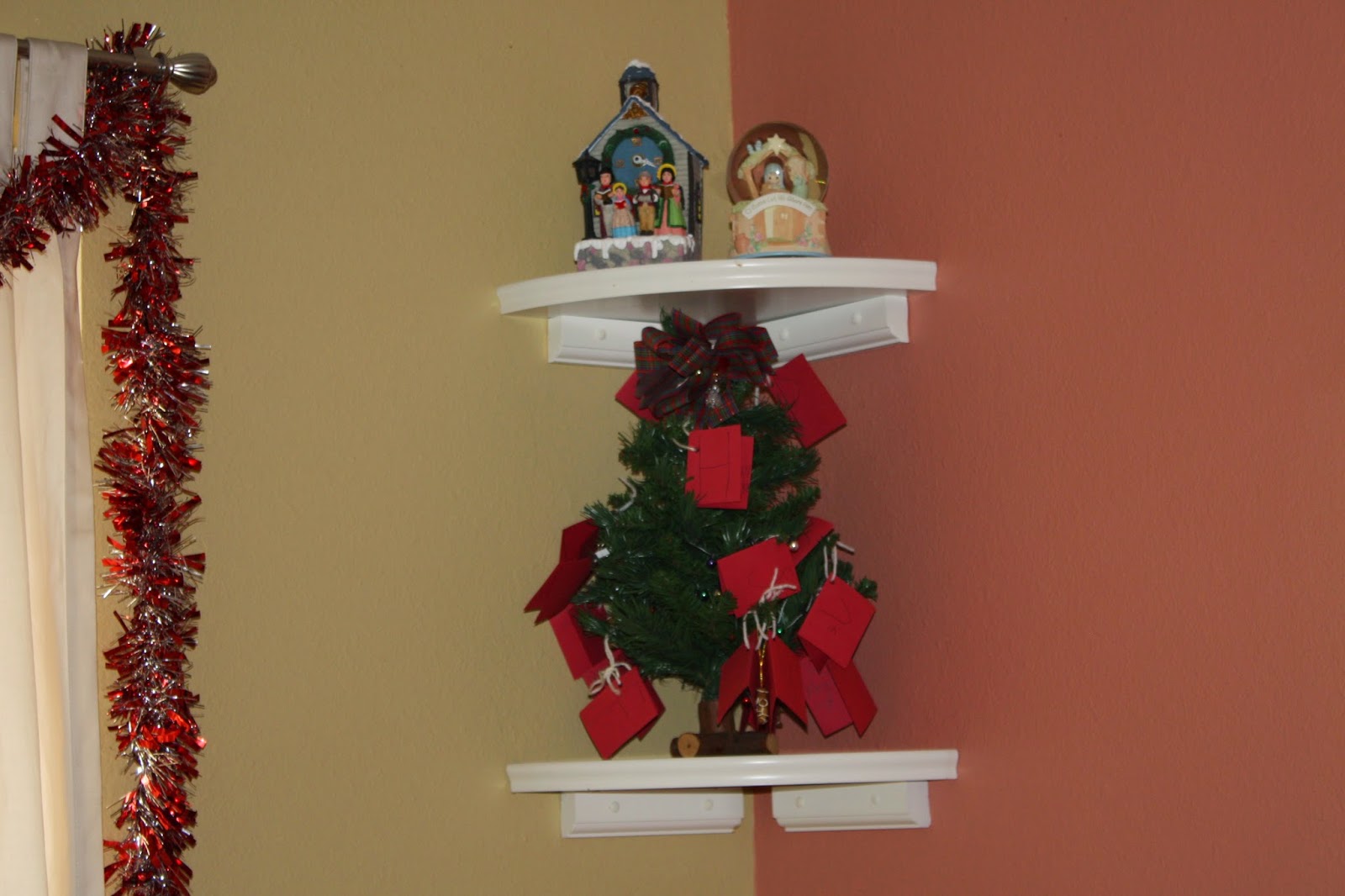Last year the kids and I did this again, except this time we kept better records. I cut little pieces of red paper, folded it in half and had one of them write the letter on the front. Then, when you open it up, on the inside is the scripture we picked. Then I punched a hole at the top, strung some yarn through it and hung it on an old, worn out miniature tree I almost threw away. This is just what I had on hand.