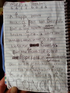 Mackenzie has been writing down some scripture verses that stand out to her. She started with Proverbs 15:13. Then she liked the next verse, so wrote it down and it became Proverbs 15:13-14. Then she liked the next one, so wrote it again and it became Proverbs 15:13-14-15. She has finally stopped at verse 19. She loved these words so much she took them to her guitar teacher and they added chords and a beat to it. She brought verse 17 to me and told me I needed to put this on my blog. It says, “A few vegetables where there is love is better than the finest meat with hatred.” Pretty true.